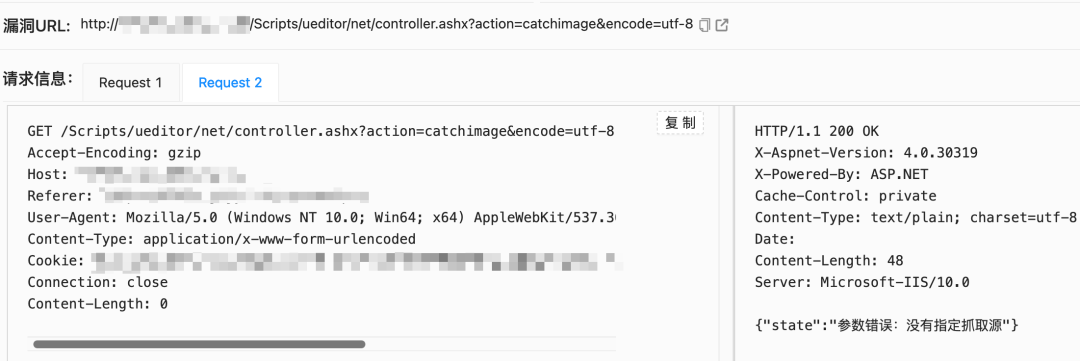 但是组件型Nday漏洞,例如最广为人知的ueditor的aspx文件上传漏洞,虽然漏洞路径无非就是/ueditor/net/controller.ashx?action=catchimage&encode=utf-8(1.2.6版本后不是control,是imageup),但是它可能在根目录下,也可能在/js目录下,更可能在/lib,/script……各种个样的目录下。相比较而言,更加隐蔽,也就更容易成为漏网之鱼。