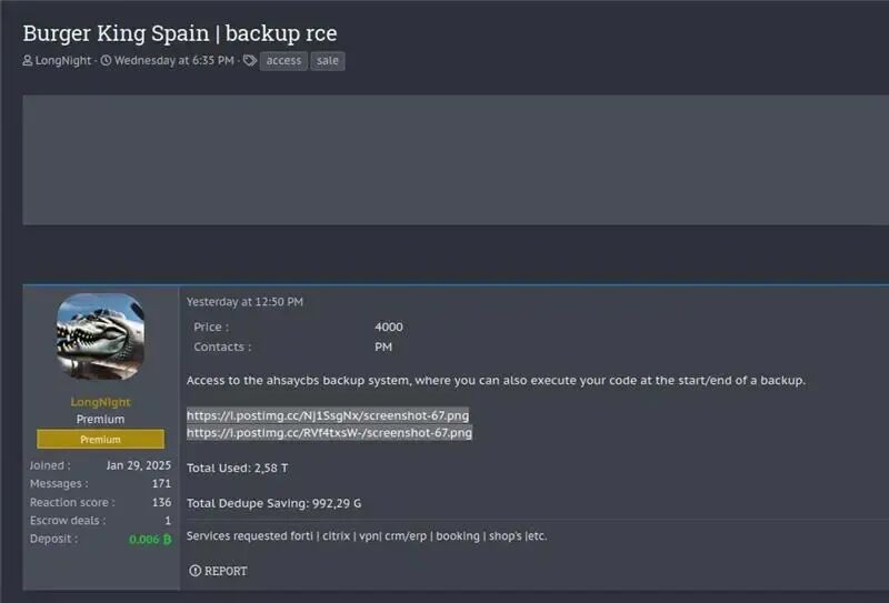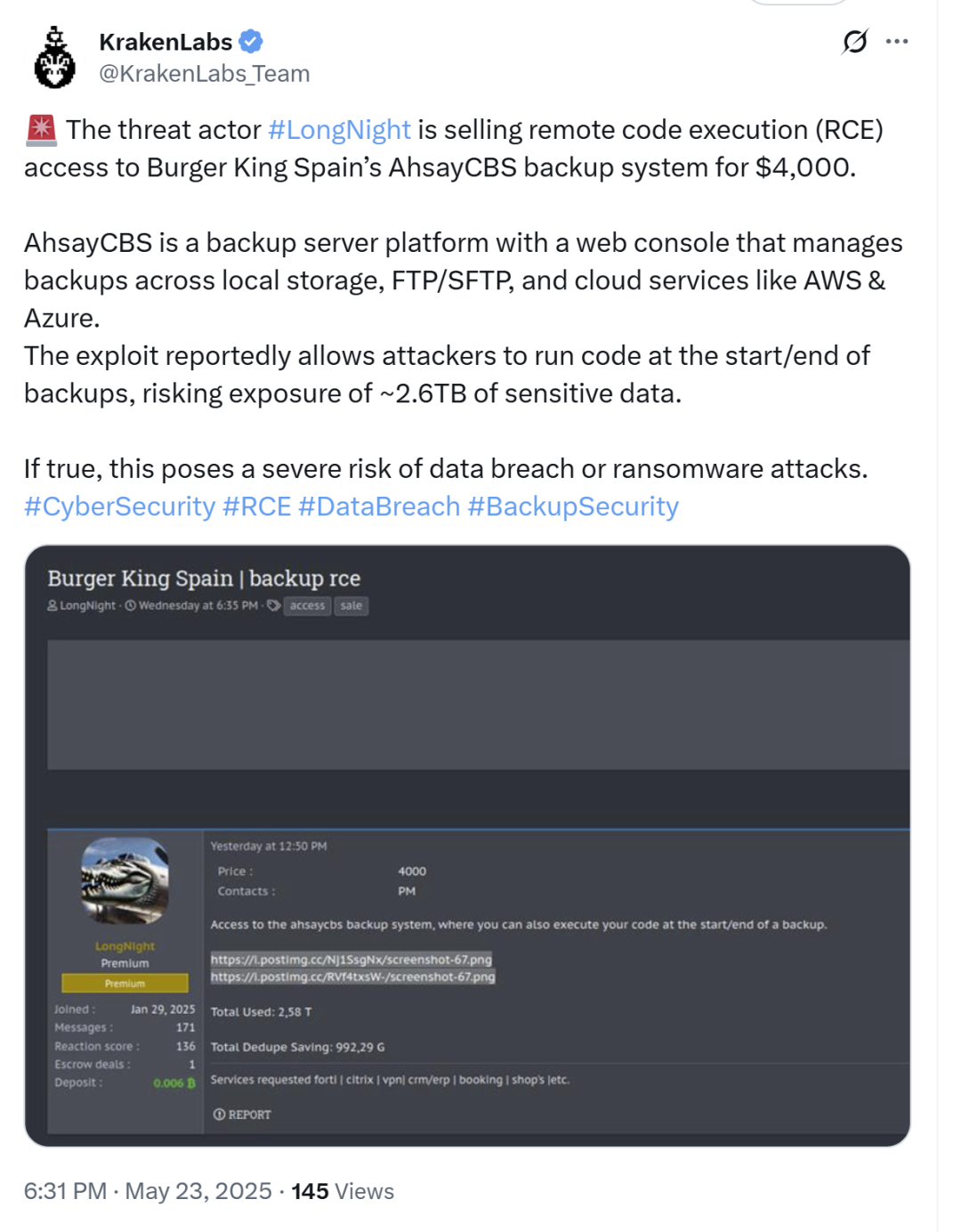 威胁行为者#LongNight正在以4000美元的价格出售汉堡王西班牙公司AhsayCBS备份系统的远程代码执行(RCE)访问权限。AhsayCBS是一个带有Web控制台的备份服务器平台,可管理本地存储、FTP/SFTP以及AWS和Azure等云服务的备份。据报道,该漏洞允许攻击者在备份开始/结束时运行代码,从而导致约2.6TB的敏感数据泄露。如果情况属实,这将带来严重的数据泄露或勒索软件攻击风险。