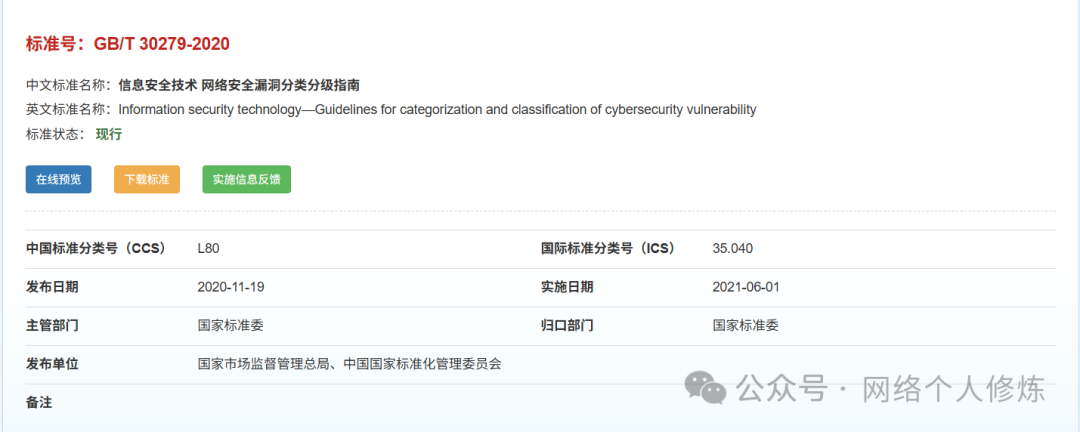 中国国家标准化管理委员会发布的 GB/T 30279 – 2020《信息安全技术 网络安全漏洞分类分级指南》,全文22页,自 2021 年 6 月 1 日正式实施。