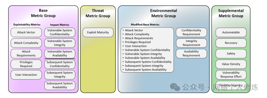 CVSS 由基本 Base、威胁 Threat、环境 Environment 和补充 Supplemental(可选)四个指标组构成,每个指标组又包含一系列具体指标。