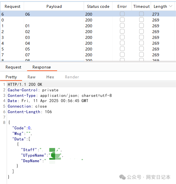 爆破后可以看到成功查询的响应包要长一些,利用此接口获取了大量身份证号码信息。