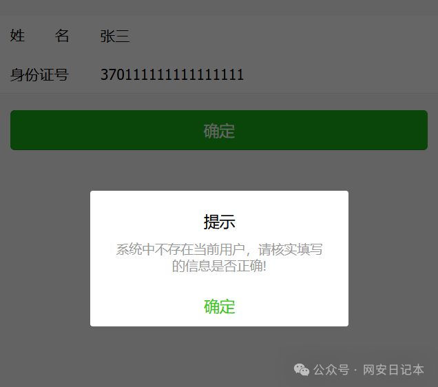 当姓名和身份证号错误或不存在时,会提示 “系统中不存在当前用户,请核实填写的信息是否正确”。