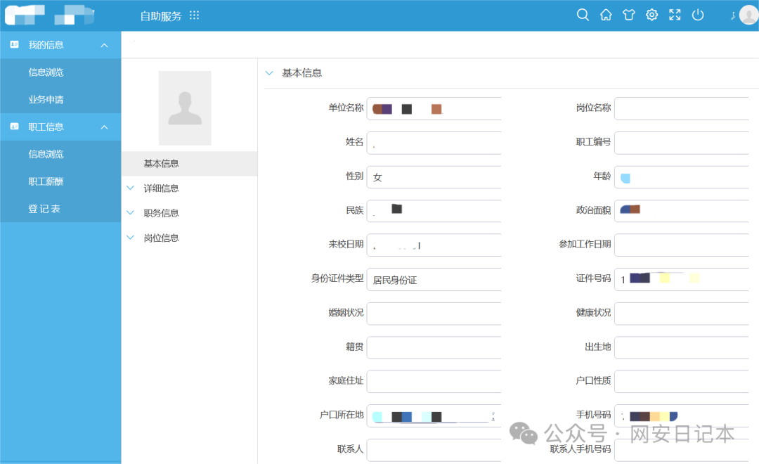 依旧是通过信息收集,发现了统一门户等多个系统默认密码都是身份证号后六位,而账号就是学/工号,后面就是尝试利用获取的信息进行登录,成功登录了多个系统,其中某管理系统中大量弱口令未修改,且基本信息中包含证件号码,也就是身份证号。