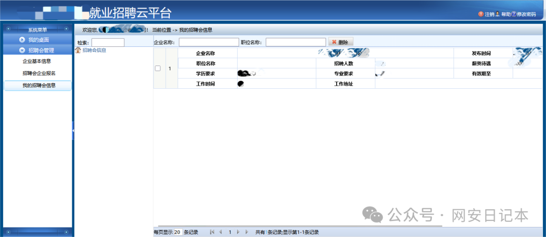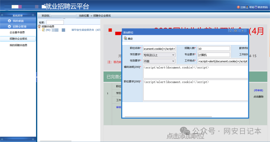 成功注册登录之后,发现功能点也很少,但是好在站点比较老旧,感觉很容易出洞。在点击 “招聘会企业报名” 中发现可以发布招聘信息,尝试在招聘信息中插入XSS语句。