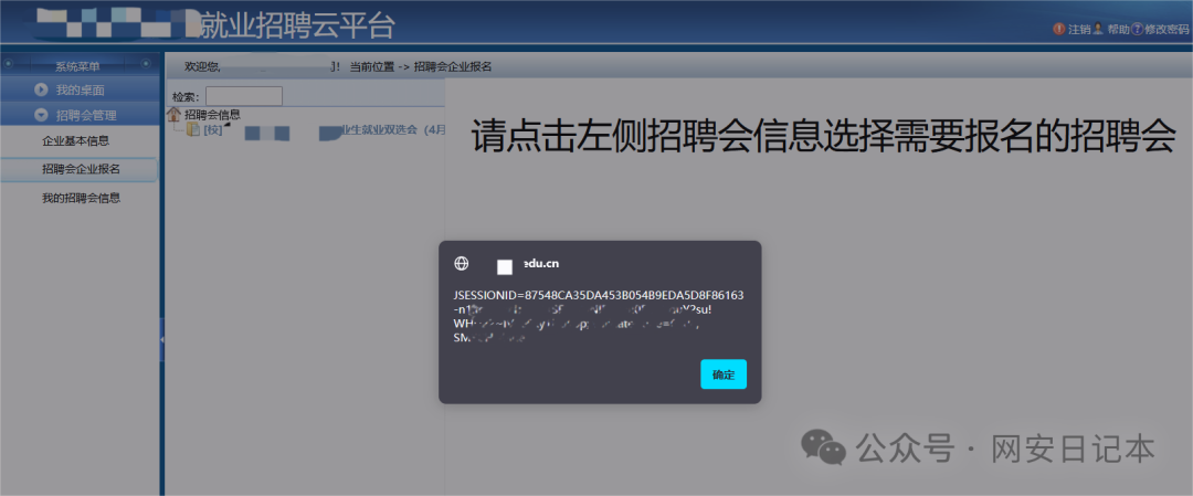 成功添加后重新点击“招聘会信息”成功触发XSS,可获取用户cookie。