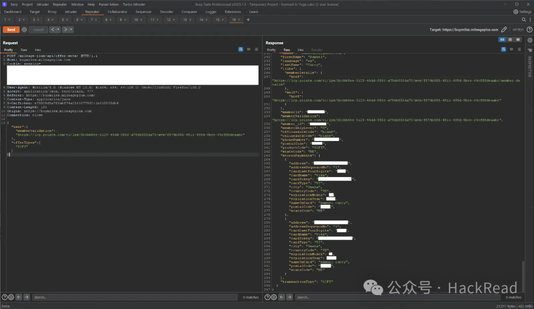 该漏洞的工作原理如下:通过在正常的网页 UI 中输入他们的名字、姓氏和奖励号码,服务器会在 HTTP 响应中返回一个授权令牌,该令牌可用于检索他们的账单地址、电话号码、电子邮件、隐藏的信用卡信息和账单历史。我们还可以利用该令牌代表他们转移里程。