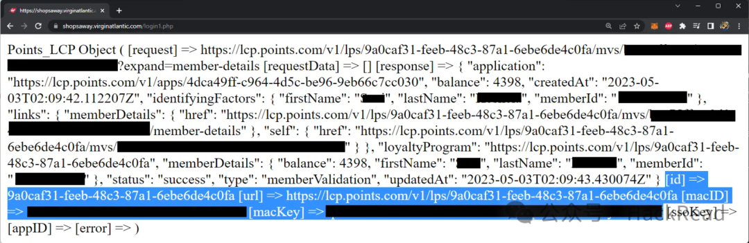 这些密钥包括了客户的授权令牌,但更有趣的是,里面还泄露了“macID”和“macKey”值,我们推测这些是维珍在 points.com 生产租户账户中使用的密钥!
