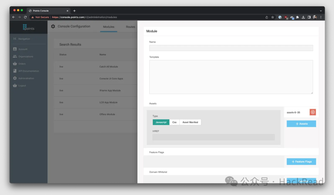 “console.points.com” 网站上的另两个有趣页面是模块和路由端点。攻击者可以按预期使用这些端点,将恶意 JavaScript 添加到管理面板的每个页面上。如果未被检测到,这将成为一个超级有趣的后门,攻击者的 JavaScript 将在管理网站的每个页面上加载。