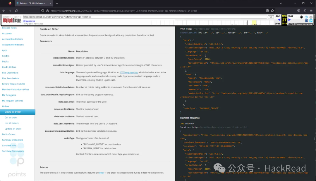 在 GitHub 上搜索并阅读了几个小时的 points.com 相关文档后,我们发现了一个专为奖励计划打造的 API,运行在 “lcp.points.com” 网站上。在浏览一些公开代码库时,我们找到了一个指向 “lcp.points.com” API 文档的链接,不过这个文档已从网上删除。幸运的是,我们在 archive.org 上找到了它的存档版本。