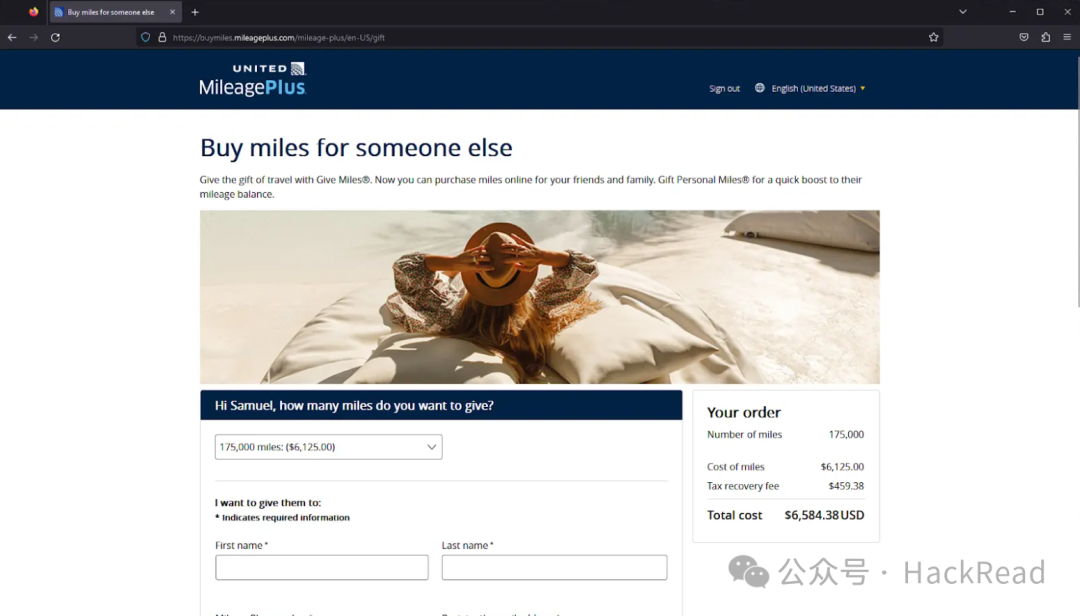 在我们继续寻找泄露“memberValidation”令牌的漏洞时,发现了 United 网站上的一个流程,标题为“为他人购买里程”。