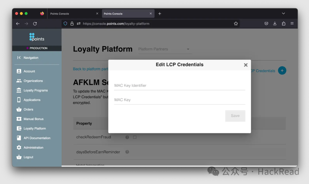 在登录该门户网站后,我们发现它其实是一个奖励计划的管理控制台,奖励计划可以在其中初始化和管理类似 OAuth 类型的应用程序。这些应用程序会被分配用于与 “LCP API”(即 “Loyalty Commerce Platform”,忠诚度商务平台)交互的 API 密钥,而该 API 的主机正是 “lcp.points.com”。