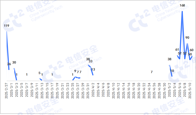 从2025年2月至5月期间,电信安全持续监测到境外高级持续性威胁组织Mallox勒索团伙对我国关键信息基础设施发动了大规模定向攻击,攻击特征呈现为“波浪式”,攻击活动主要集中在三个爆发周期: