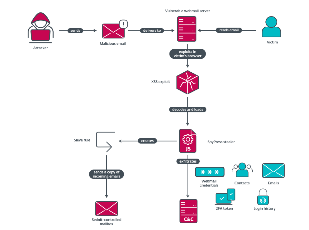 SpyPress.HORDE专门针对Horde网络邮件,通过创建隐藏的HTML输入元素来窃取凭据;SpyPress.MDAEMON则更为复杂,不仅能窃取凭据,还能窃取联系人信息、登录历史记录、电子邮件消息,甚至能够窃取双因素认证(2FA)密钥,并创建应用程序密码以绕过2FA保护。在Roundcube邮件系统中,攻击者使用的载荷名为SpyPress.ROUNDCUBE。该载荷不仅能够直接窃取用户在登录表单中输入的用户名和密码,还通过创建一个iframe,强制用户登出并重新登录,同时在真实登录表单的提交按钮上设置回调函数,进一步窃取用户重新输入的凭证。此外,SpyPress.ROUNDCUBE还访问并窃取了用户的地址簿以及Roundcube的设置页面信息,这些信息对于攻击者了解受害者的组织架构和系统配置至关重要。更为严重的是,SpyPress.ROUNDCUBE还具备邮件窃取功能。它每两小时执行一次邮件窃取例程,遍历用户的所有邮箱,获取邮件ID,并从服务器上获取邮件源码进行窃取。为了规避检测,该载荷在连续窃取超过150封邮件后会主动暂停,直到下次例程执行。在某些样本中,SpyPress.ROUNDCUBE甚至创建了恶意的Sieve规则,将所有收到的邮件副本发送到攻击者控制的邮箱地址,实现了对受害者邮件系统的全面监控。