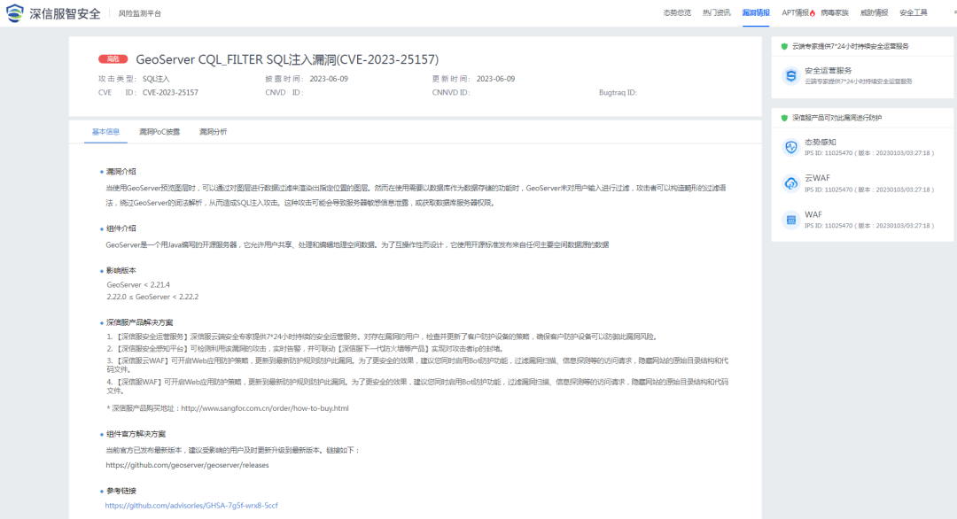 2023年6月9日,深信服安全团队监测到一则GeoServer组件存在SQL注入漏洞的信息,漏洞威胁等级:高危。