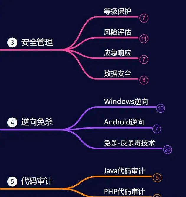 比如等级保护、应急响应、风险评估、逆向免杀、代码审计、二进制漏洞攻击、木马技术、内核安全、移动安全、侧信道攻击等等,当然在学习的时候,不用像专业方向的同学那么深入,但需要涉猎了解,丰富自己的知识面,构建全方位的网路安全知识技能栈。