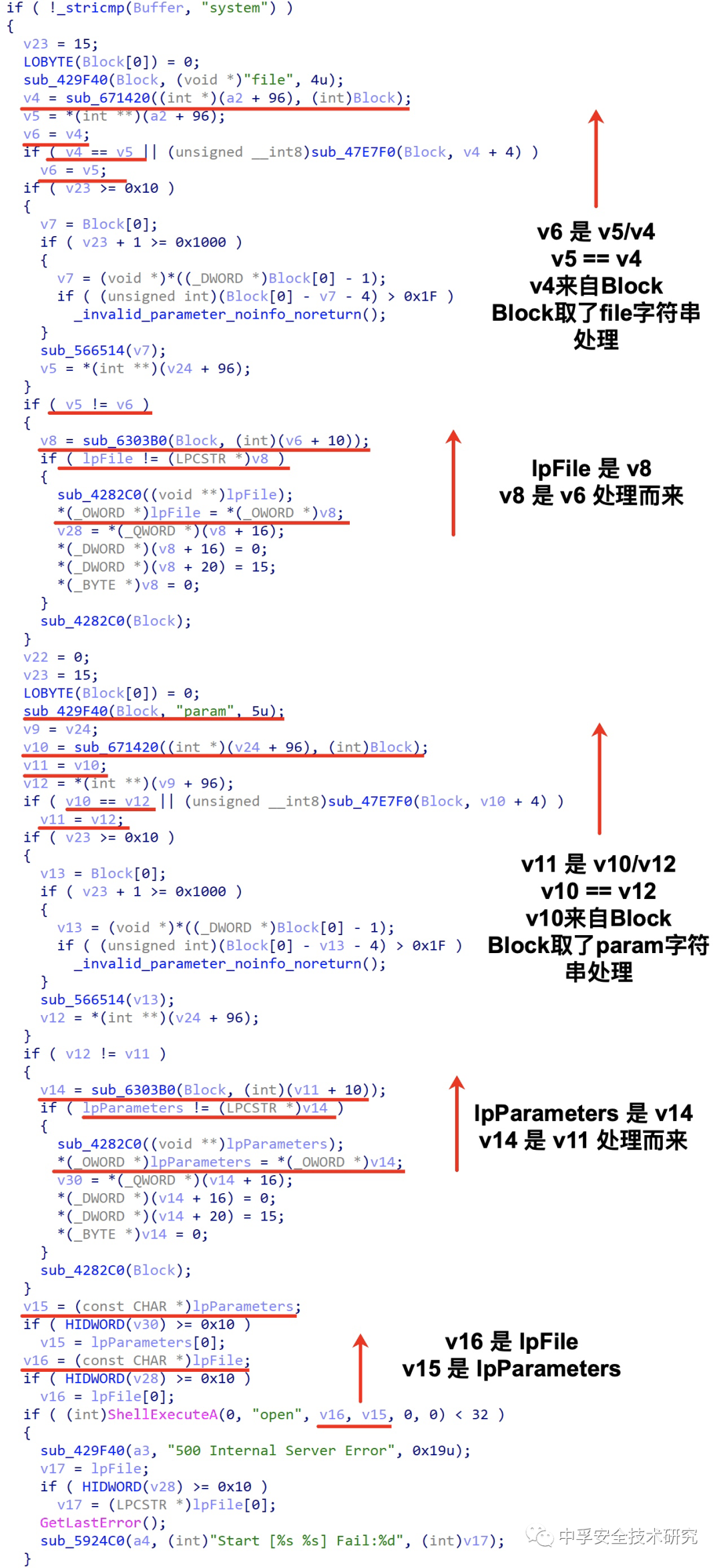 所以我们可以跟进函数004203B0在IDA中看一下它具体做了什么,这样我们才能构造请求让真正的字符串带入到ShellExecuteA函数中执行。