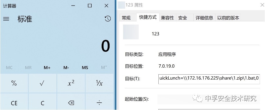因此我们可以在共享文件夹中创建1.zip,放入内容为calc的1.bat文件。