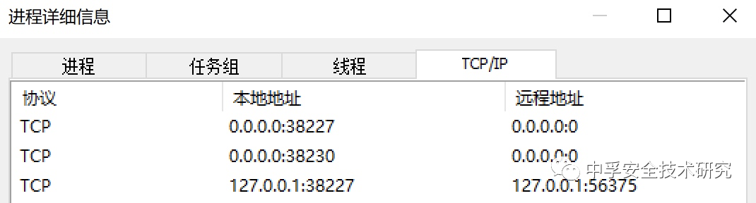 如下图所示,安装完某远程服务平台客户端后,我通过火绒剑逐个查看对应的进程信息,在TCP/IP窗口中看见当前进程的网络通信或监听信息。如下图所示就是UserClient.exe进程当前的网络通信信息,我们可以看到它在本地监听了两个端口:38227、38230。