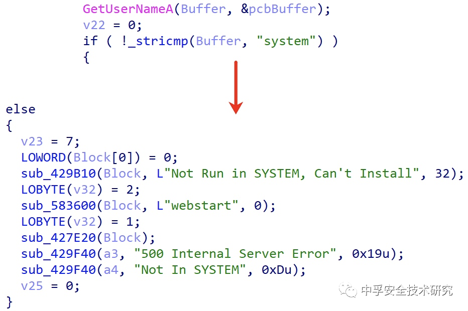 在函数的一开始就判断运行当前程序的用户是否是system,如果不是的话则直接返回响应内容(状态码500)提示当前不是以SYSTEM权限运行的进程。