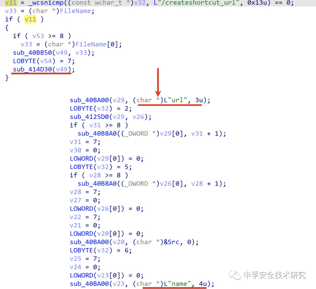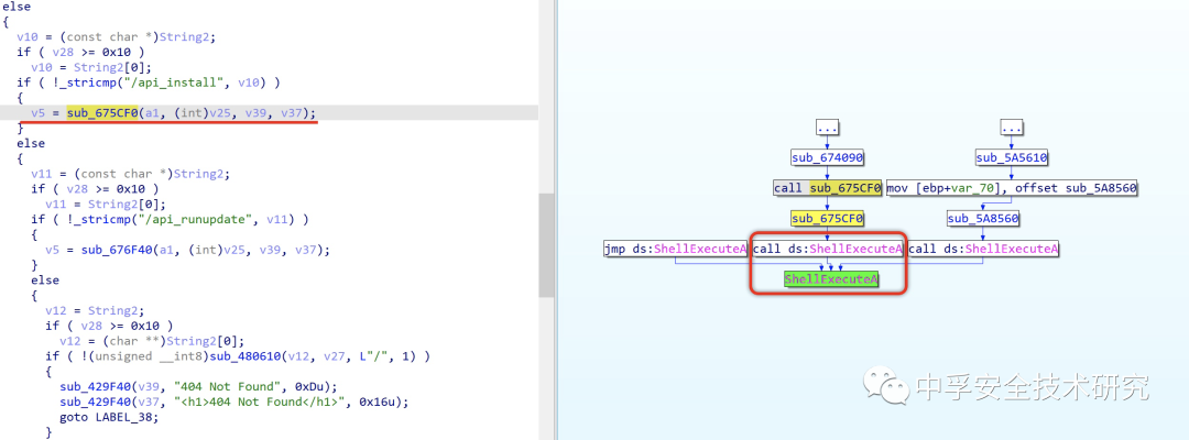 如果你觉得这样去看很累,也可以基于敏感函数的调用链来对应每个URI的处理函数,如下图所示我就基于ShellExecuteA函数的调用链找到了URI/api_install的对应处理函数,也就表示当你访问URL:http://127.0.0.1:38230/api_install时很有可能就会触发ShellExecuteA函数。