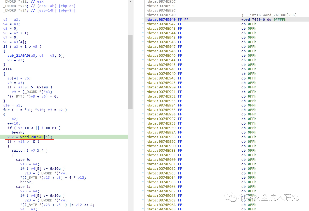 在IDA中跟进函数004203B0,它实际上也是调用的另外一个函数00370C70,在该函数里对字符串进行位移转换,猜测可能是自定义的解码方式。但是在它进行遍历的过程中使用到了一段数组数据word_74E940,我们跟进这个数据之后发现似乎是一张解码表。