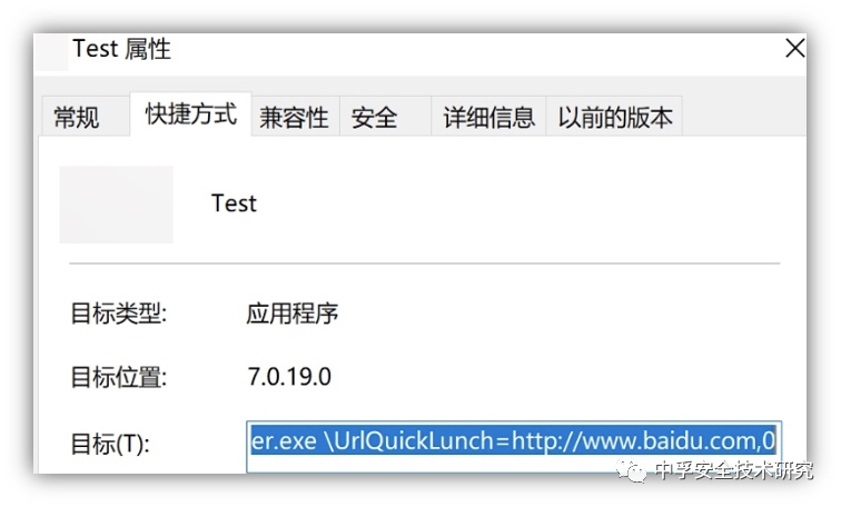 因此我们可以构建伪协议URL:xxplayer://action.cmd/createshortcut_url?url=http://www.baidu.com&name=Test,访问就发现它创建了一个名为Test的快捷方式,目标为:C:\xxplayer.exe \UrlQuickLunch=http://www.baidu.com,0,也就表示我们传入的url参数值变成了启动参数,name参数值变成了快捷方式名字。