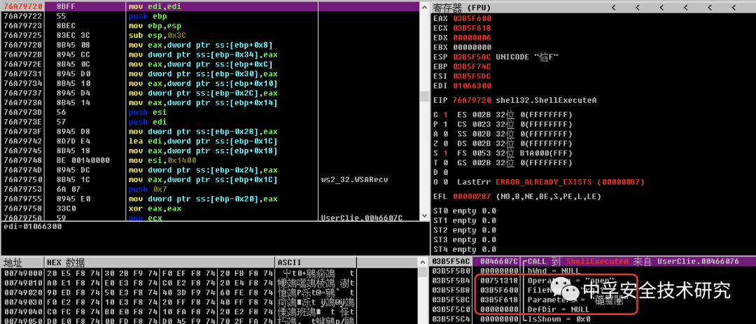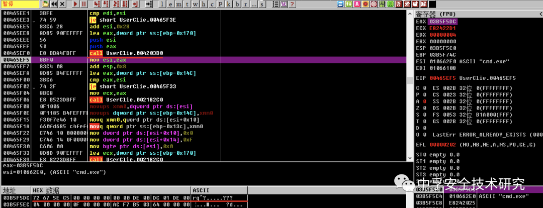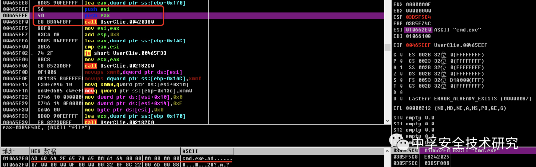 接着走下去我们会发现调用如下函数时的参数就是我们的请求参数file和对应值cmd.exe,当该函数执行完成之后返回到EAX寄存器,我们跟进EAX寄存器的地址查看数据就会发现数据为乱码内容,也就是我们在ShellExecuteA函数断点处看见的参数。