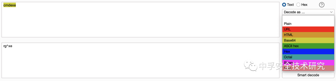我们可以将cmd.exe字符串进行Base64解码,发现结果确实为我们之前所看到的乱码内容: