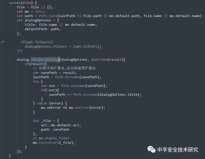 首先是saveAs方法,它会调用一个文件保存框,然后赋值调用retryStart方法: