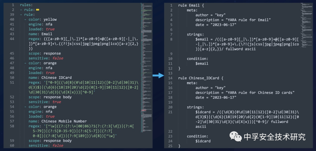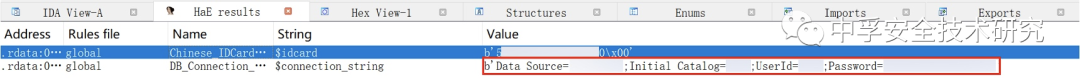对于客户端的信息泄露,我一开始采用的方式就是基于IDA Strings进行敏感的字符串信息匹配,将HaE的规则转为Yara规则再通过FindCrypt3插件进行匹配。