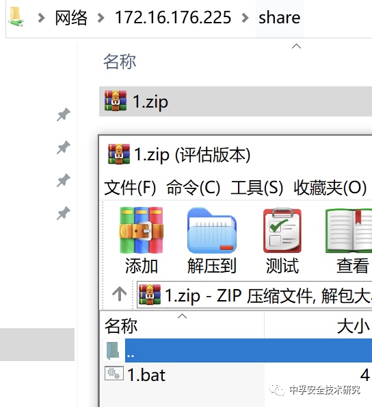 使用远程Jar包的方式来达到任意命令执行还是有局限性,如果目标机器不存在Java环境就无法执行,因此在对文件信任机制的研究发现在smb共享文件中打开zip压缩包内的bat文件,不会有任何弹窗提示直接执行bat文件内容。