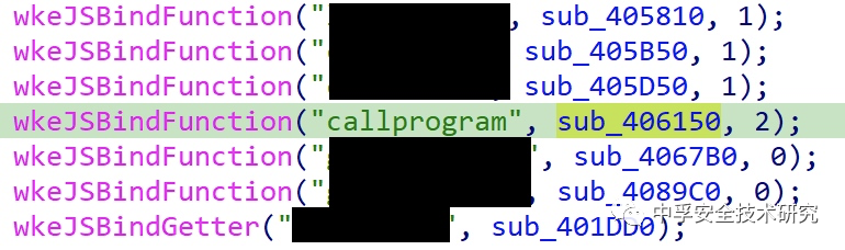基于IDA分析得知,目标应用使用了该方法将JS函数与C++函数进行了绑定。图下图所示,其将C++某个函数地址,与名为callprogram的JavaScript函数进行绑定,我们可以直接在JS代码中调用。