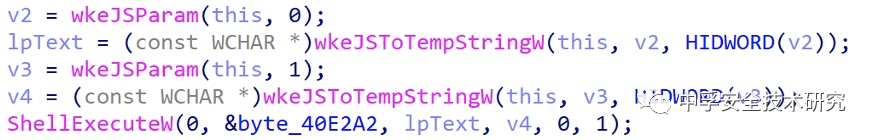 跟进对应的C++函数,我们发现它会通过wkeJSParam获取参数,再通过JSToTempStringW获取字符串形式的参数值,最终将两个参数带入ShellExecuteW函数执行。即最终执行的代码为:ShellExecuteW(0, “open”, 参数1, 参数2, 0, 1)。