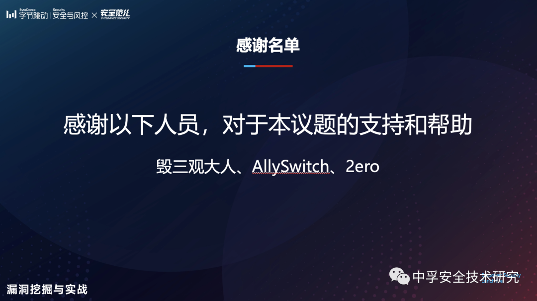 在文章的最后,我要感谢公司部门领导和同事对本议题的贡献和帮助(以下排名不分先后),感谢字节跳动安全中心对于本次沙龙的筹办和策划。