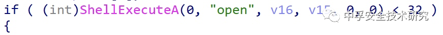 也就表示我们当前是满足这个条件的,所以可以接着看IF分支内的逻辑。在IF分支内就执行了ShellExecuteA