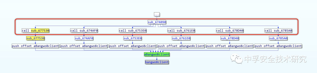 除了我们跟进的这个函数外其他的函数逻辑都大致一样,并且我们通过IDA插件CTO查看调用关系,发现这些函数最终都是被同一个函数sub_674090调用。