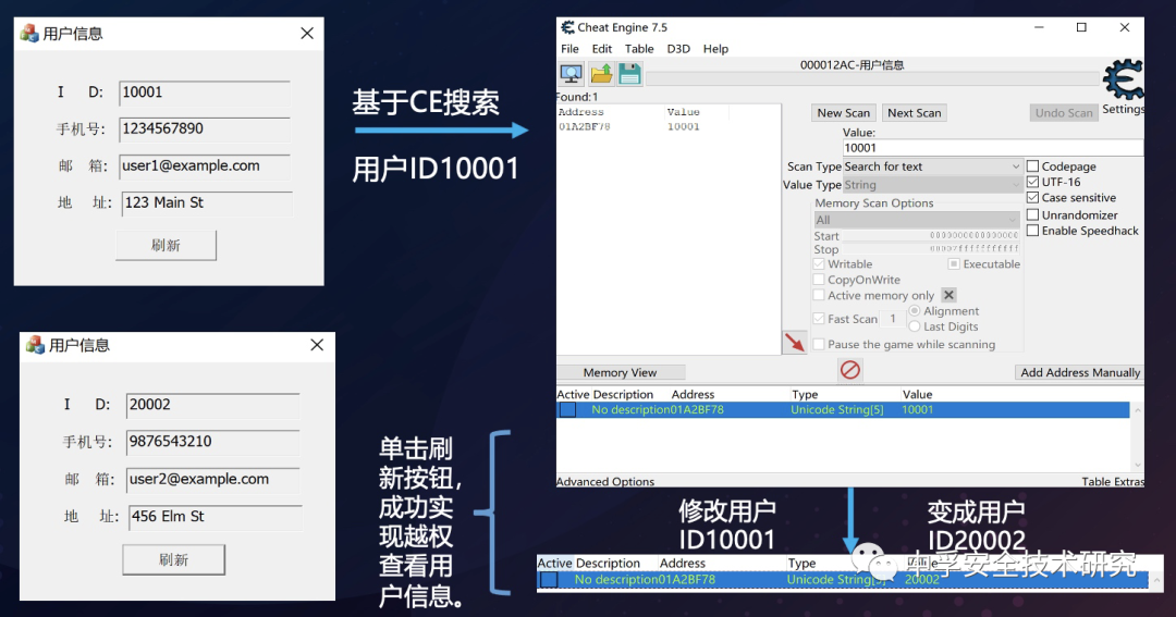 很多客户端程序在对用户信息进行获取的时候会通过内存的方式,来获取用户的编号,从而基于此进一步来获取用户的信息。然而这种方式并不是完全可信的,我们可以通过CE来对内存进行修改,从而导致越权漏洞的产生。