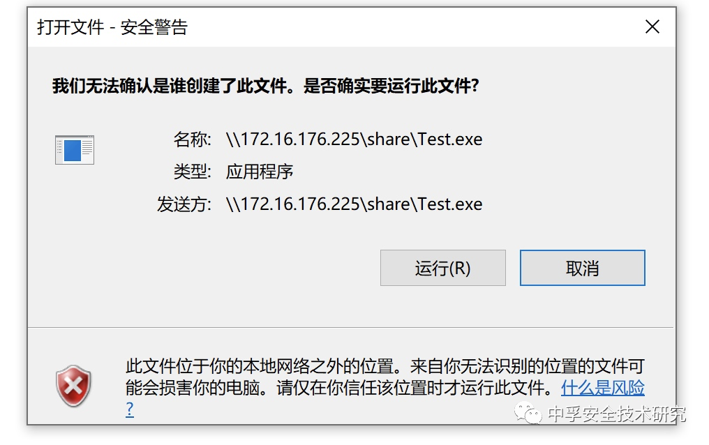 ,使用快捷方式打开共享文件,发现确实可以打开EXE文件,但是会有文件信任的安全警告(Mark-of-the-Web)。