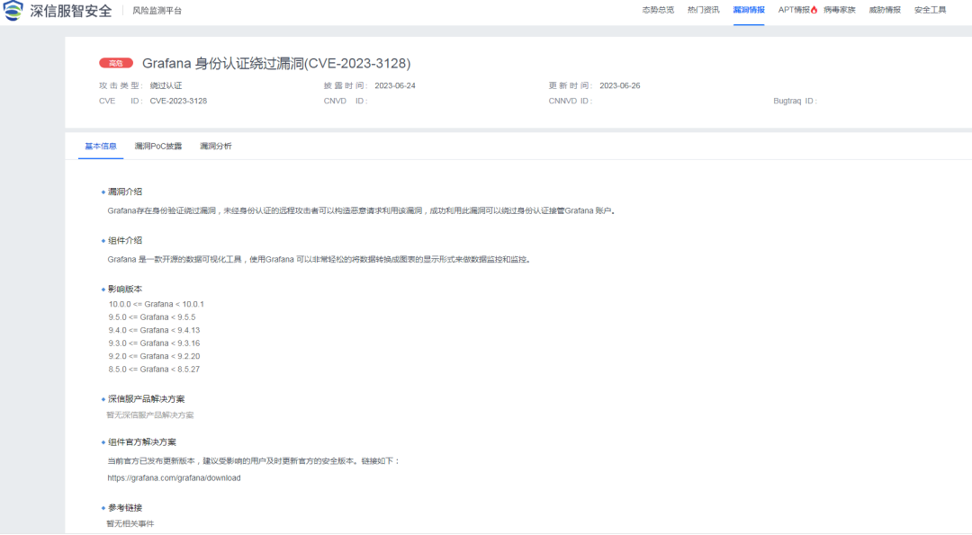 2023年6月26日,深信服安全团队监测到一则Grafana组件存在身份认证绕过漏洞的信息,漏洞编号:CVE-2023-3128,漏洞威胁等级:高危。