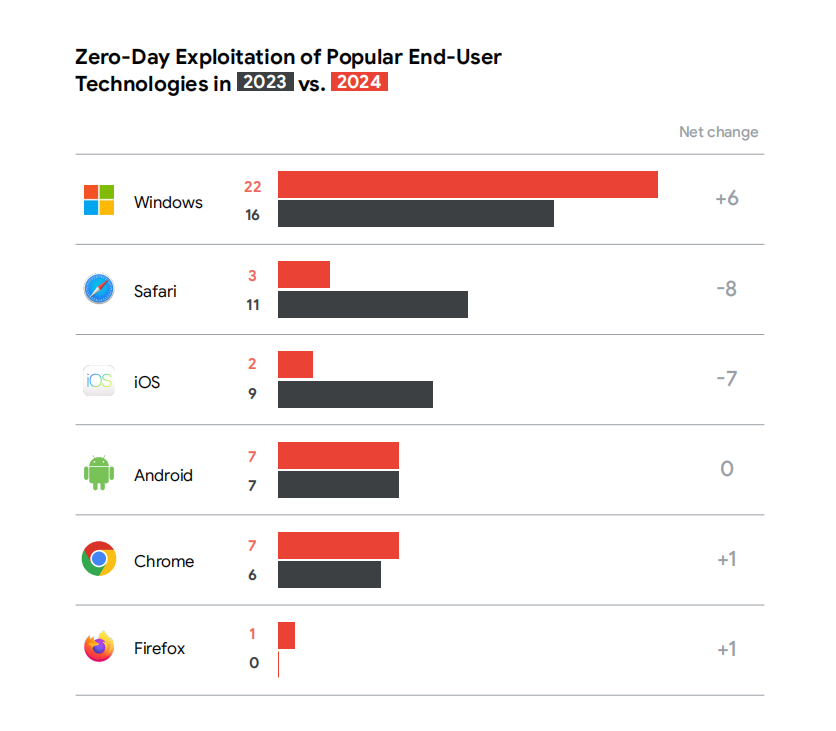 针对微软 Windows 系统的漏洞利用持续增加,从 2022 年的 13 个零日漏洞,增加到 2023 年的 16 个,再到 2024 年的 22 个。预计它将继续成为威胁行为者进行零日漏洞利用和 “已公开日期” 漏洞利用(即在漏洞补丁发布后仍被利用的漏洞)的热门目标。