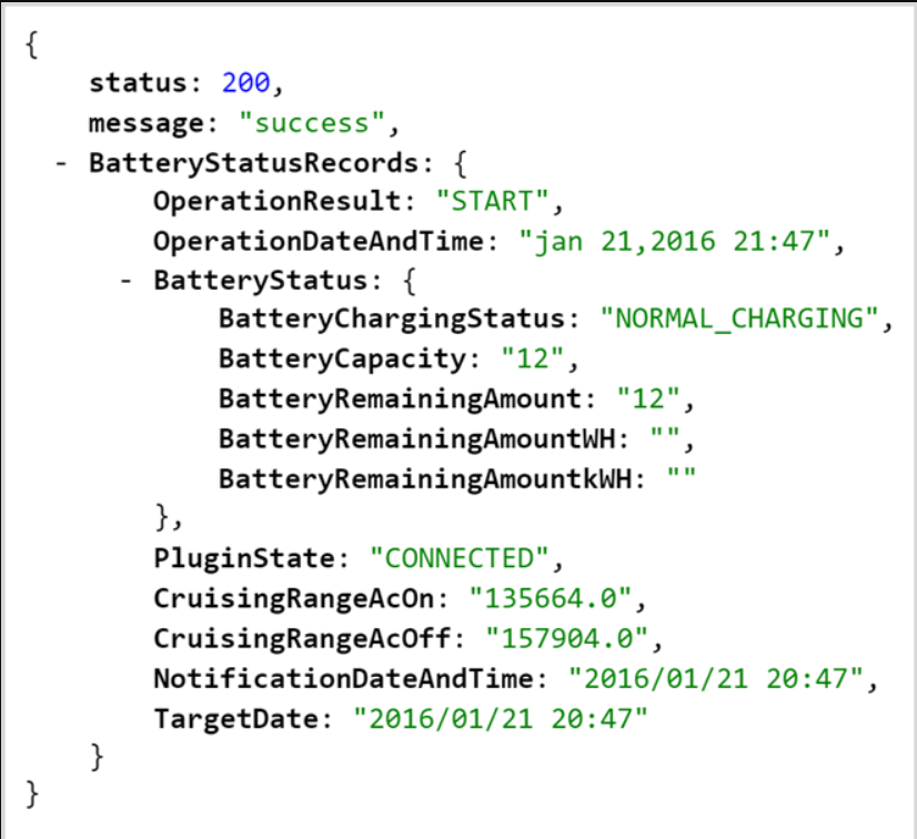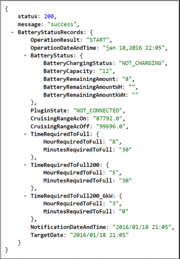 上面的 VIN 仅在最后五位数字上有所不同。我们取下这个号码并将其代入请求以获取电池状态——这是一个既不改变任何内容也不泄露任何隐私的请求——并得到了如下响应: