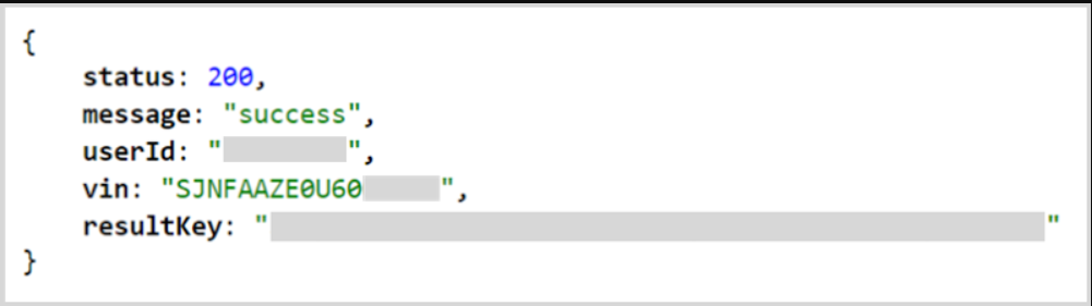这似乎表明响应无法被处理,但原因尚不清楚。经过反思,有可能该 VIN 并未在应用中注册。也有可能我之前分享的第一个 URL 中的某个查询字符串参数对于该 VIN 无效。例如,RegionCode 字段可能与车辆所在位置不匹配。由于无法从 API 得到明确的正面响应,我们不能断言确实存在授权缺失的问题。