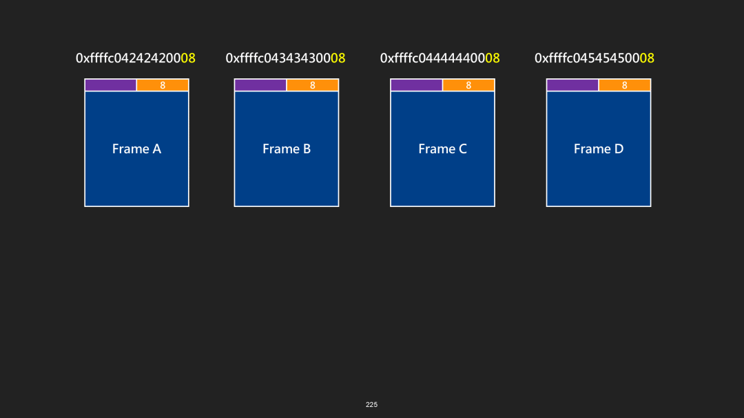 )的地址以满足 0x10 字节对齐要求。然后将这个对齐后的地址存储在 Frame B 的 next 指针字段中
