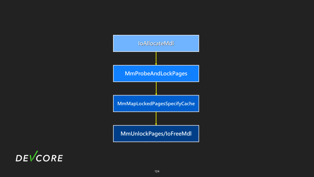 )或 DPC(Deferred Procedure Call,延迟过程调用)中——它通常依赖 MDL 来安全地描述和锁定该内存。通常,这个过程会调用下图所示的一组 API。