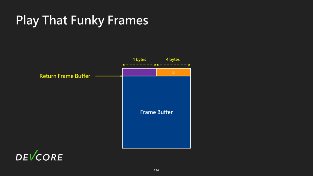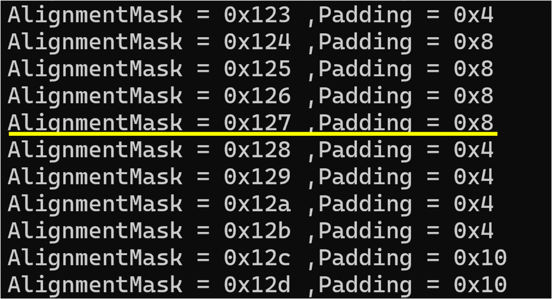紫色区域代表填充部分,蓝色区域对应帧缓冲区本身。帧缓冲区前面的 4 个字节用于存储填充大小。在正常情况下,对齐掩码应该是 2 的幂减一(例如 0x3F、0xFFF 等)。