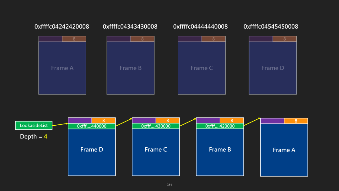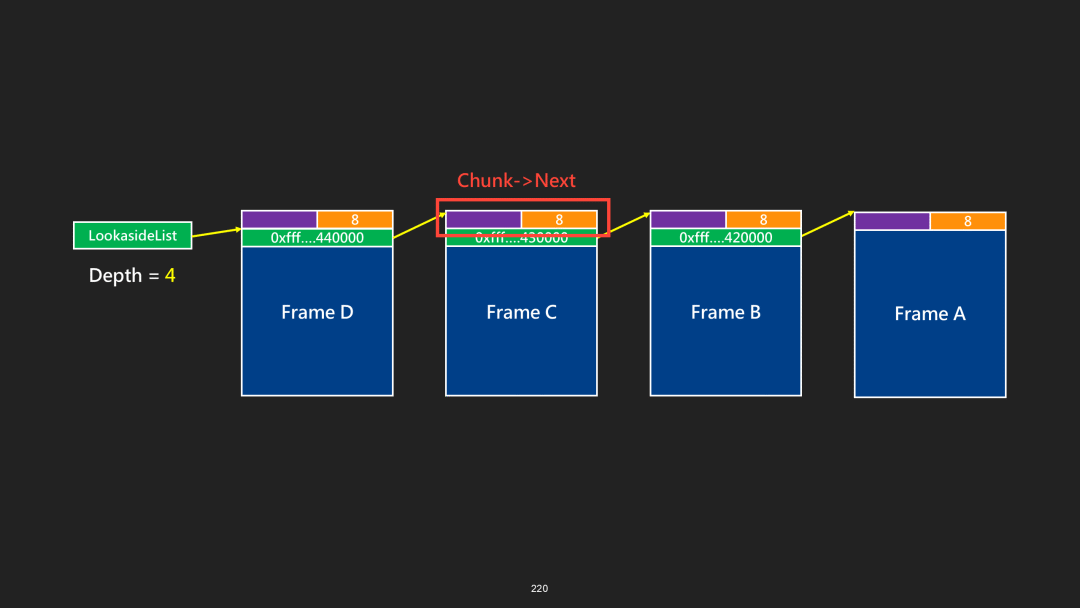 一旦第一个块从链表中弹出,链表就会转变为上图所示的状态。接下来,我们从 LookasideList