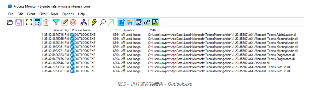 要开始搜寻,我们首先要启动应用程序。Microsoft Office 产品与其他应用程序之间存在大量的交叉兼容性和支持,尤其是 Outlook 和 Teams。通过监控这些应用程序,我注意到 Outlook 会从 AppData 加载多个 DLL。深入研究这些事件后,我发现 Microsoft Teams 版本 2(又名 Microsoft Teams for Work and School)和 Microsoft Teams Classic 中都存在易受攻击的 DLL(用于代理)。当使用用户的配置文件配置 Microsoft Teams v2 时,它会在 Outlook 中安装一个名为 TeamsMeetingAddin 的包(如果已安装 Outlook)。低权限用户可以修改包含此加载项关联 DLL 的文件夹,从而重命名合法 DLL 并添加恶意 DLL。这意味着下次启动 Outlook 时,恶意 DLL 会被 Outlook 加载,从而导致 Outlook 进程中的代码执行。低权限用户可以修改此目录中的所有文件。